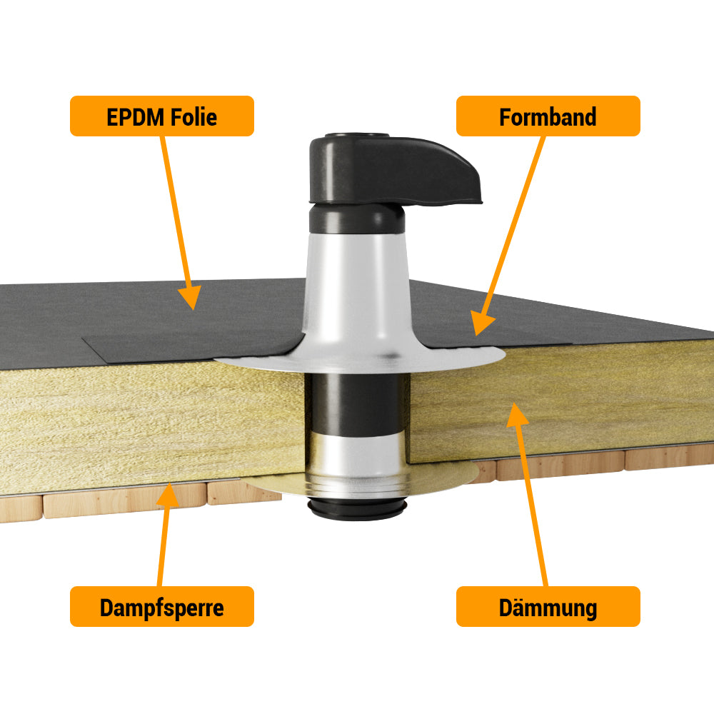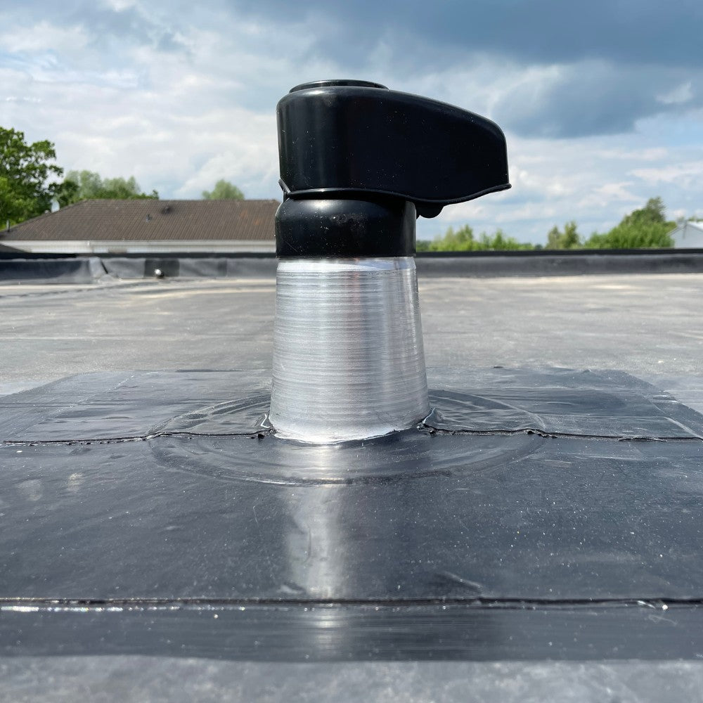 Für die sichere Durchführung von Kabeln durch Flachdächer (EPDM Folie, Bitumen, Resitrix, TPO, etc.) – erhältlich für Anschlussgrößen DN60 und DN100.