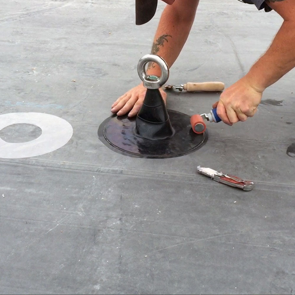 Das auf der Unterseite werkseitig laminierte Nahtband ermöglicht eine kraftschlüssige Verbindung mit der EPDM Dachfolie – für dauerhaft dichte und sichere Rohrdurchführungen im System DACHPROTECT.