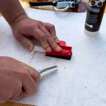 Mit der Silicut-Schneidehilfe lassen sich Dichtstoff- und Klebstoffdüsen präzise im 45° Winkel zuschneiden. Der definierte Schnittwinkel sorgt für einen sauberen und gleichmäßigen Raupenauftrag – ideal für professionelle Abdichtungs- und Klebearbeiten.