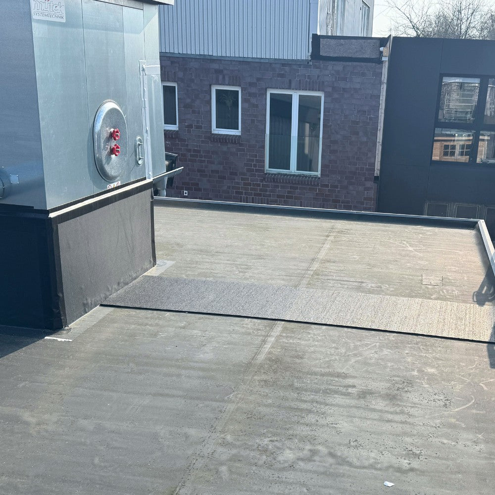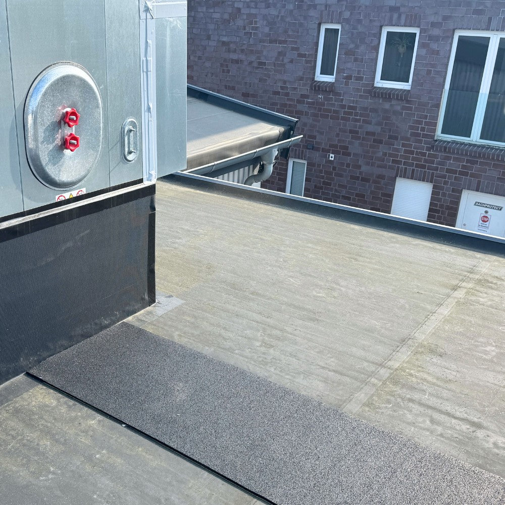 Mit dem DACHPROTECT Wartungsweg schützen Sie Ihre Dachabdichtung zuverlässig in Bereichen, die regelmäßig begangen werden – z. B. zur Wartung von Schornsteinen, Solaranlagen oder Lüftungseinheiten. Der robuste Wartungsweg aus Gummi wird einfach auf der Dachfläche aufgelegt und montagefrei ohne Durchdringung befestigt.